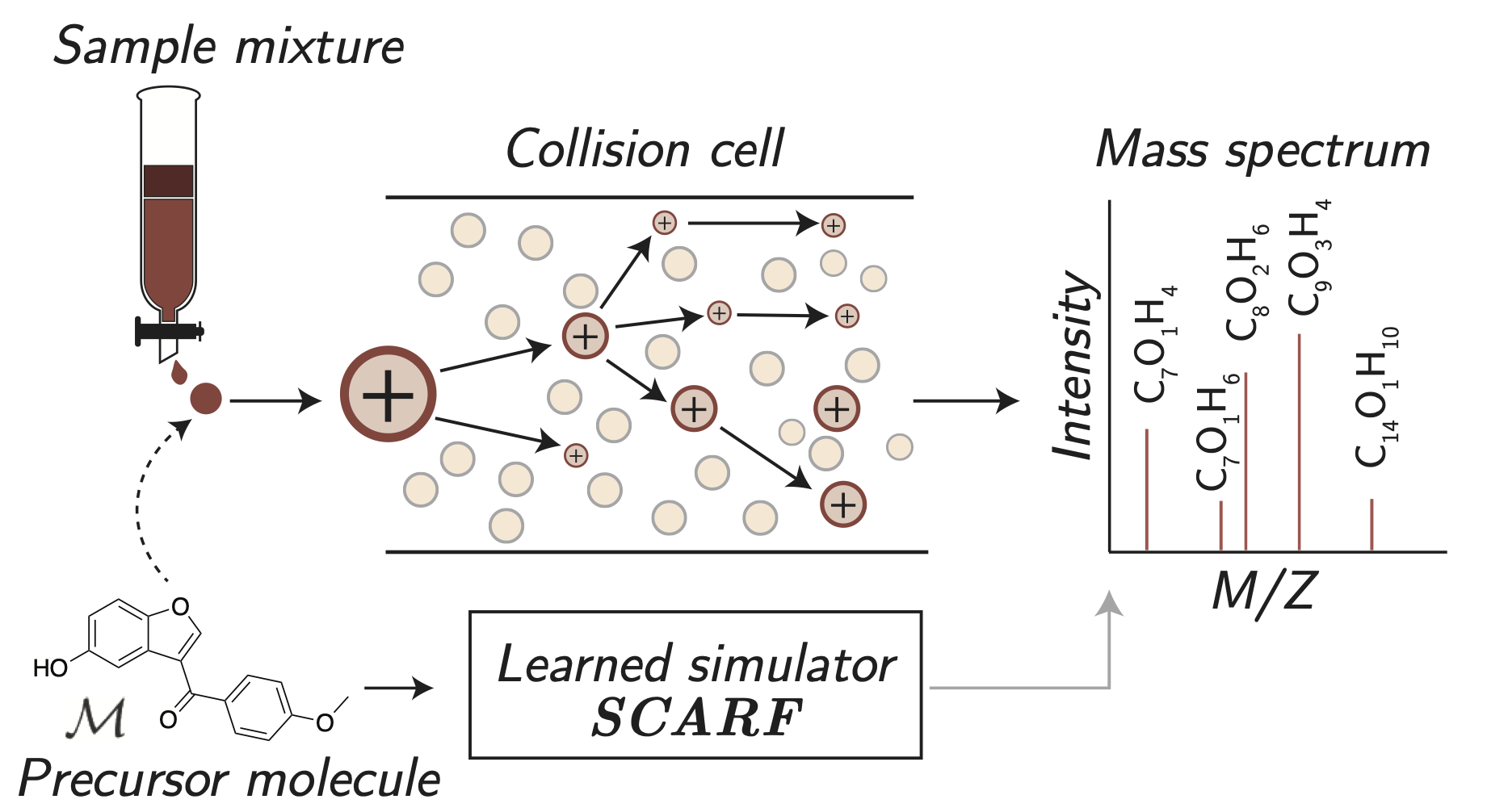 We develop a new method for predicting mass spectra from molecules via first generating the product formulae (the x axis locations of mass spectra peaks) before secondly predicting their intensities (the peaks’ heights on the y axis). In order to overcome the combinatorial explosion in the possible number of product formulae, we design an efficient and compact representation for these formulae based on prefix trees.